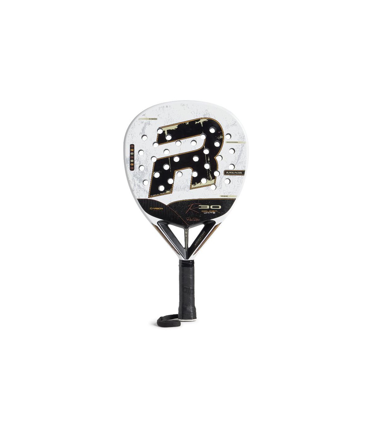 Das Royal Padel R30 White Gold 2026 besteht aus einem Diamant-Übergroßform und einem hohen Balance, Merkmalen, die es zur perfekten Wahl für offensive Spieler machen. Sein weicher Gummischenkern (Polyethylen) bietet eine weiche und elastische Berührung, die es ermöglicht, Vibrationen aufzunehmen und einen kontrollierten Kugelauslass sicherzustellen, selbst in den intensivsten Schlägen. Die Kombination von fortschrittlichen Materialien wie Fibertech und Kohlenstoff auf der Oberfläche sorgt für obere Strukturfestigkeit und optimale Energieübertragung.