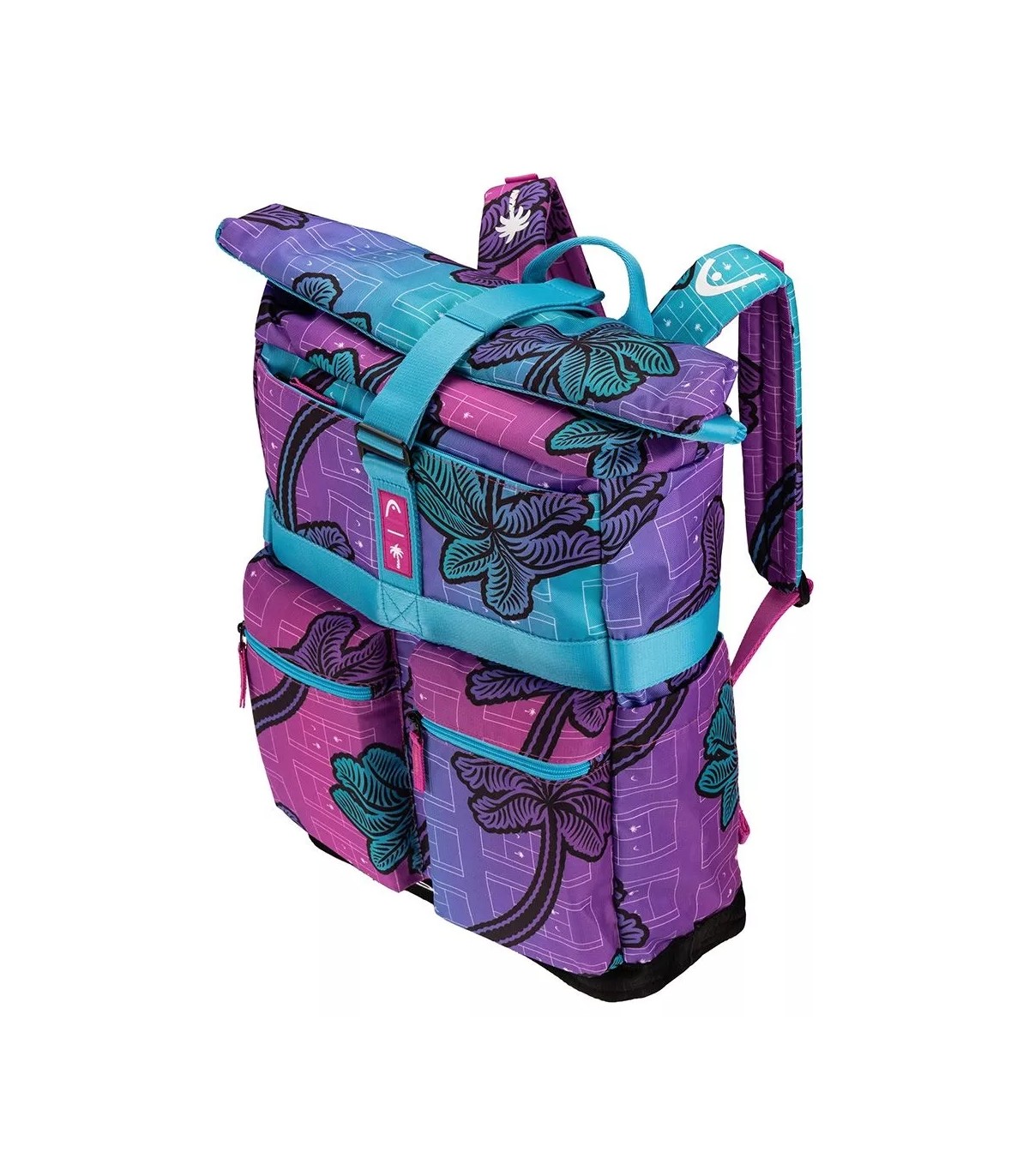 Its unique design, adorned with a palm tree pattern in vibrant shades of blue and purple, offers a fun and dynamic look that won't go unnoticed. Whether you're heading to a tennis match or taking a stroll through the city, this backpack will attract all eyes.