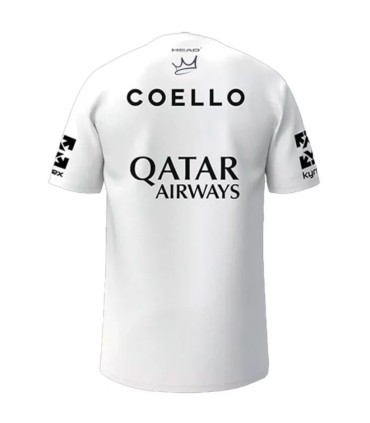 The T-shirt HEAD Arturo Coello 2025 White It is an essential piece for paddle fans who wish to express their admiration for the renowned Spanish player Arturo Coello and highlight on the track. This t-shirt is an exact replica of the official jersey that looks Coello during its competitions, including the logos of its sponsors, which makes it a very coveted item by its followers.