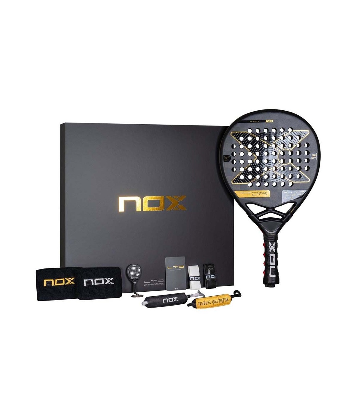 Included in this exclusive package, you will find two black wristbands with silver and gold logos, two specially designed interchangeable straps for this model, two Nox overgrips, and a keychain replica of the AT10 Genius 2025 LTD Edition paddle.