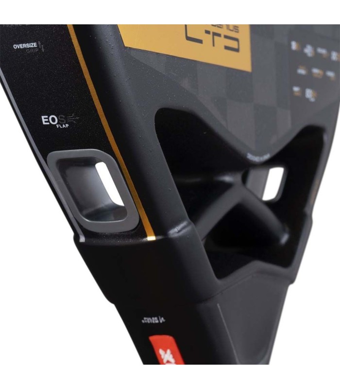 The aerodynamic design, enhanced by the EOS Flap technology, allows for greater maneuverability and speed, while the Dynamic Composite Structure (DCS) achieves a smooth transition between the frame and the paddle head, reducing the difference in hardness and thus improving ball control.