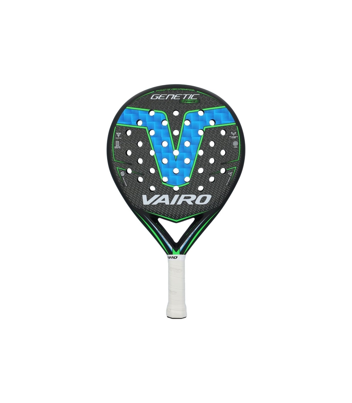 Made with a 100% carbon structure, both in the frame and the tubular, the Vairo Genetic Power Blue offers exceptional resistance, rigidity, and lightness. These features allow players to experience optimal control during the game without compromising mobility or maneuverability. The Black EVA Soft rubber core efficiently absorbs vibrations, providing unmatched comfort upon impact and a soft touch that enhances ball output.