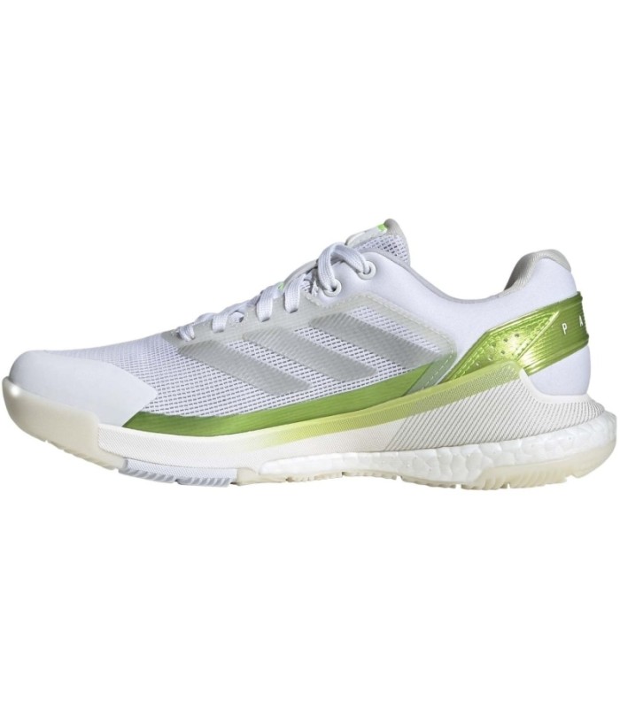 Aesthetically, the Adidas Crazyquick Padel shoes stand out for their modern design in white with metallic details and neon green accents. This color combination not only adds a fresh and current touch but also reflects the energy and dynamism that characterizes padel players.