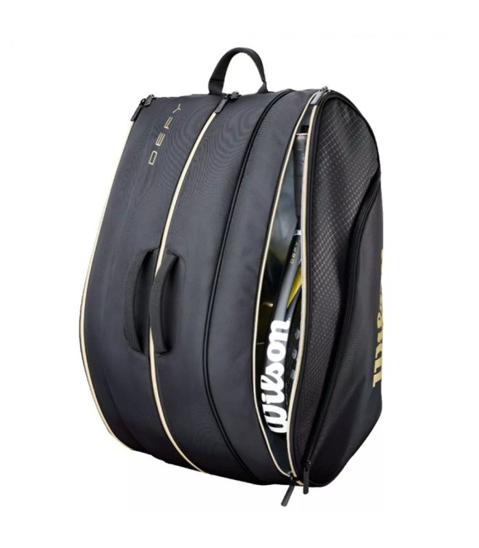 The Paddle Bag Wilson Defy V1 in color Black / gold It is the perfect choice for the demanding player who seeks not only functionality, but also style and durability. This bag is designed to provide the best organization and protect your belongings optimally, thanks to its innovative ThermoGuard Technology, which is essential to protect your blades from temperature variations that could affect your performance.