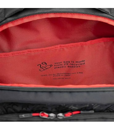 One of the most notable aspects of this backpack is its eco-friendly design, as it is made from recycled PET bottles, making it a sustainable and environmentally friendly choice. Additionally, its elegant design is enhanced by the crown-shaped logo of Arturo Coello, placed on the front with a shiny finish, adding a touch of distinction. The contrast of the silver Head logo on a black background, combined with the red interior — Coello's signature color — gives it a unique and bold character.