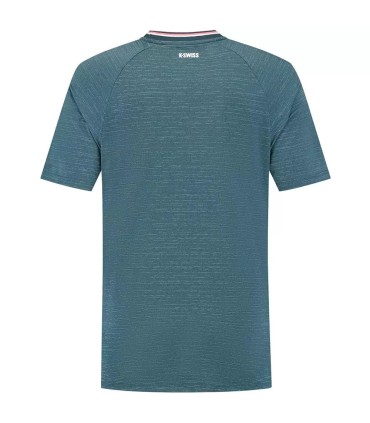 The design of the K-Swiss Hypercourt Melange Petrol Blue T-shirt is not only functional but also stylish. It features an elegant petrol blue color complemented by a black line on the collar, adding a touch of distinction and modernity. On the chest, the K-Swiss shield logo is present as a mark of quality and prestige, reflecting the brand's heritage and passion for tennis.
