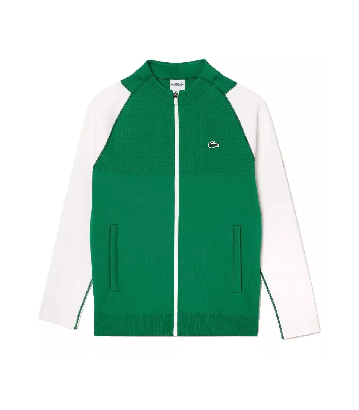 Confeccionada con jacquard de poliéster reciclado, esta chaqueta no solo es una opción elegante, sino también sostenible, reflejando el compromiso de Lacoste con el medio ambiente. Los detalles técnicos se complementan con dos prácticos bolsillos frontales, perfectos para guardar tus objetos personales o pelotas de tenis durante tus entrenamientos.