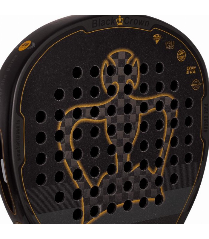 La Black Crown Patron Gold 2025 no solo destaca por sus materiales de alta calidad, sino también por su innovación tecnológica. Incorpora la exclusiva tecnología Vibralow, un sistema de amortiguación que minimiza las vibraciones mediante una goma especial ubicada en el lateral del molde. Este sistema, junto con las hendiduras laterales y pasadores en el corazón de la pala, ayuda a reducir el impacto en el codo, previniendo lesiones y mejorando la comodidad en cada golpe.