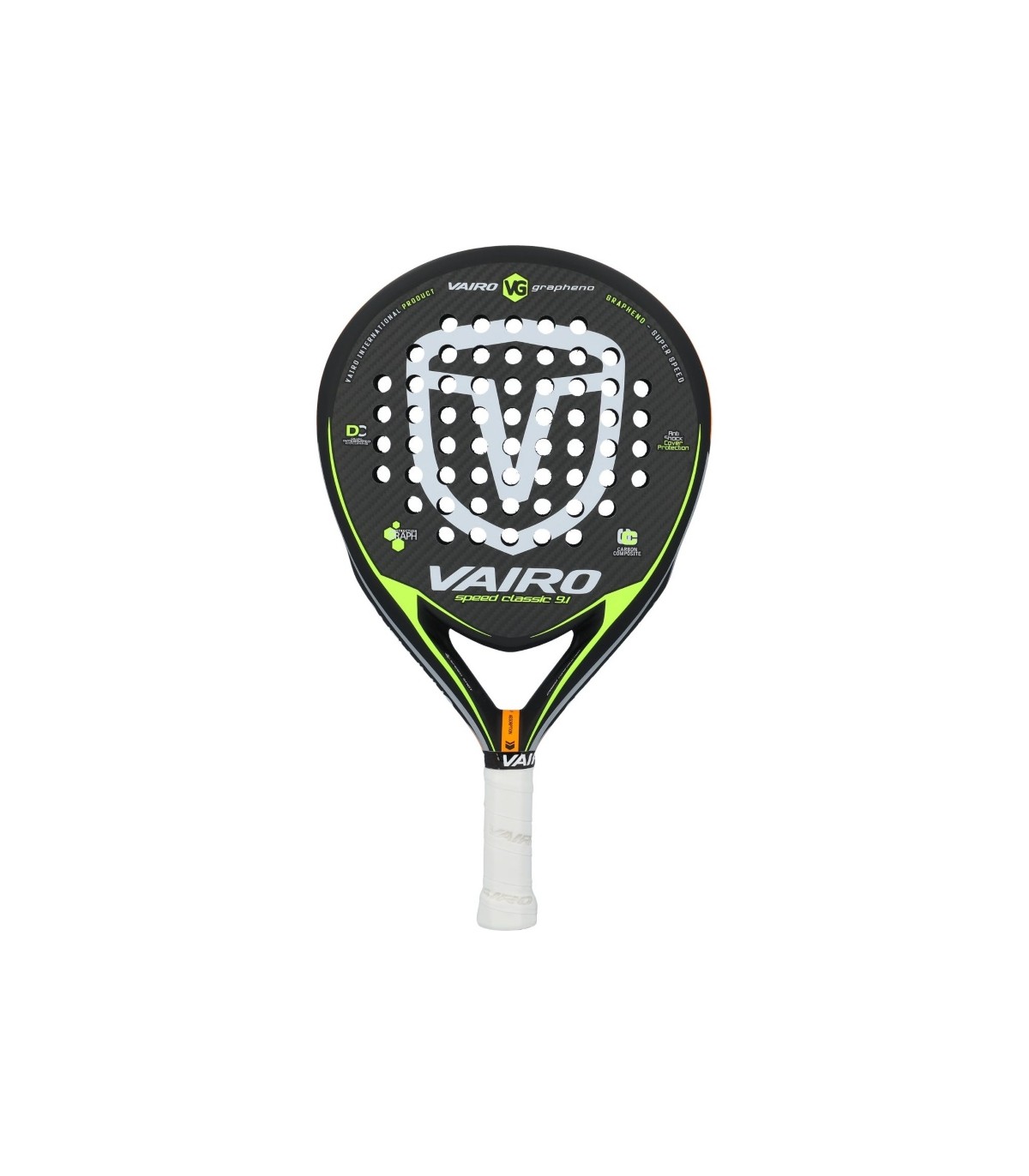 Visualmente, la Vairo Grapheno Speed destaca por su diseño moderno y enérgico, con una combinación de colores que incluye amarillo, blanco y naranja. Este diseño no solo impresiona dentro y fuera de la pista, sino que también refleja la calidad y el rendimiento superior de la pala. Fabricada con materiales premium, es ideal para aquellos jugadores que dominan el juego con precisión y buscan equipamiento que esté a la altura de sus habilidades.