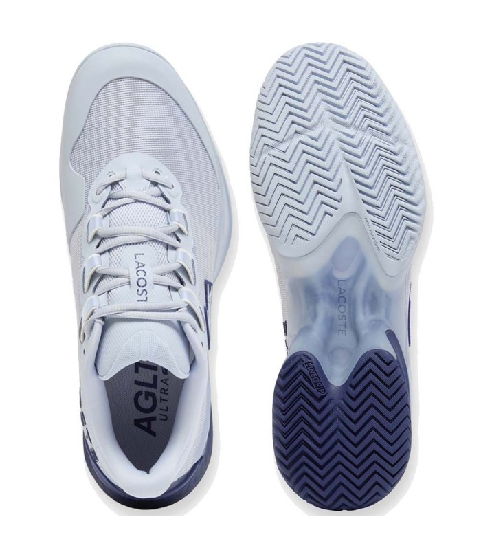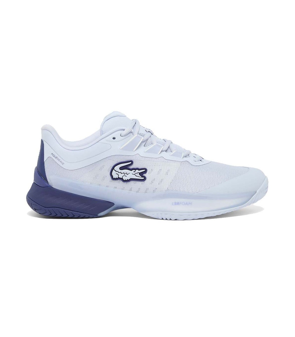En la parte inferior, la entresuela incorpora la espuma LSR Foam (Lacoste Super Responsive Foam) que maximiza el retorno de energía en cada impacto, complementada con una cambrera en Pebax que asegura una rigidez torsional indispensable para una estabilidad estructural óptima. La suela exterior, equipada con la tecnología LineGrip, ofrece una adherencia multidireccional excepcional, asegurando frenadas, arranques y movimientos laterales seguros.