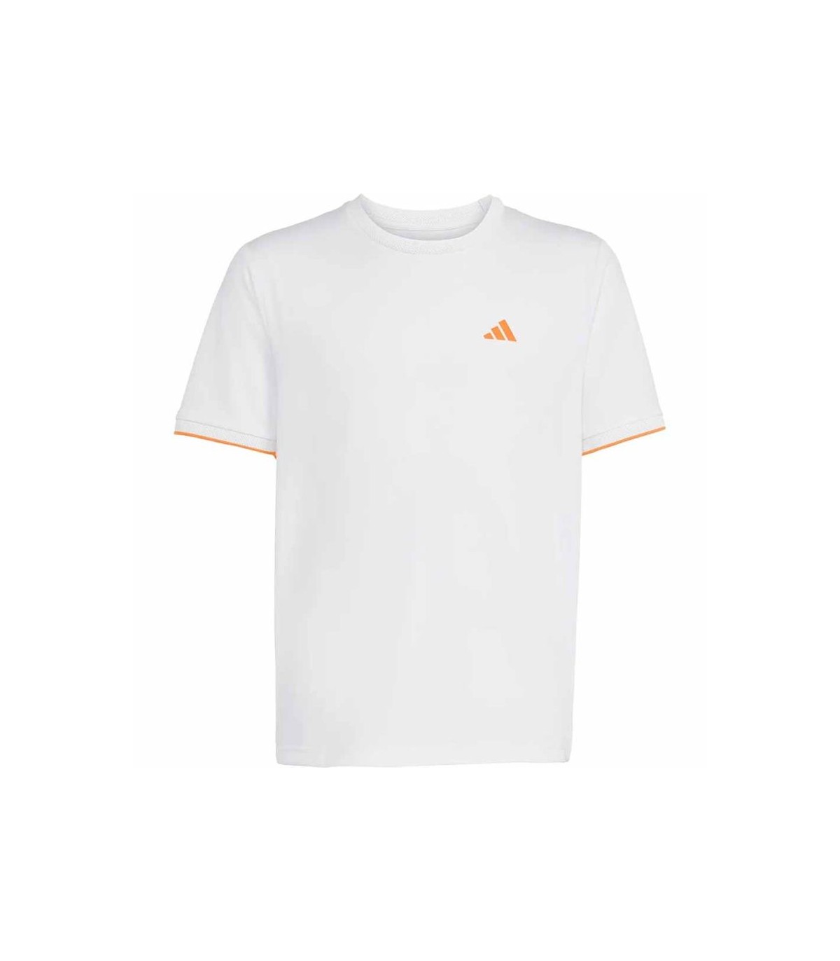 La Camiseta Adidas Pro Junior Melbourne Blanco / Naranja es ideal para jóvenes tenistas que buscan rendimiento y estilo. Con tecnología CLIMACOOL, mantiene al jugador fresco y seco. Su composición de poliéster reciclado y elastano ofrece gran libertad de movimiento, mientras que el diseño moderno en blanco con detalles naranjas añade un toque dinámico.