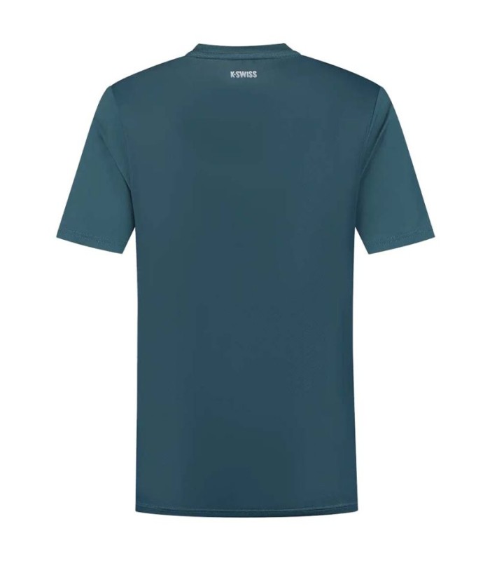 Il design della T-shirt è dinamico e sportivo, con un originale grafico e colori vivaci che forniscono una dose di stile unico sulla pista. Il logo K-Swiss, situato al petto, evidenzia l'eleganza sportiva di questo capo, rendendo la maglietta un'opzione funzionale non solo, ma anche attraente visivamente.