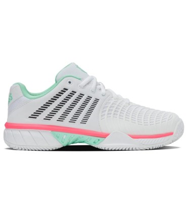 Scopri la Kswiss Express Light 3 HB Clay Shoes in un'elegante combinazione di bianco, menta e rosa, appositamente progettata per offrire prestazioni ottimali sulla pista da paddle. Queste scarpe da donna combinano stile e funzionalità, assicurando che ogni passo sia fermo e confortevole.