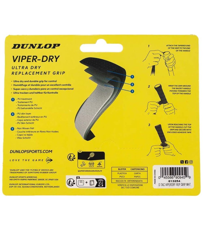 Il Grip Dunlop Viper-Dry Bianca è la scelta perfetta per coloro che non vogliono compromettere il controllo e il comfort in campo. Che tu giochi in modo ricreativo o competitivo, questo Grip si adatta alle tue esigenze, fornendo il supporto necessario per migliorare il tuo gioco.