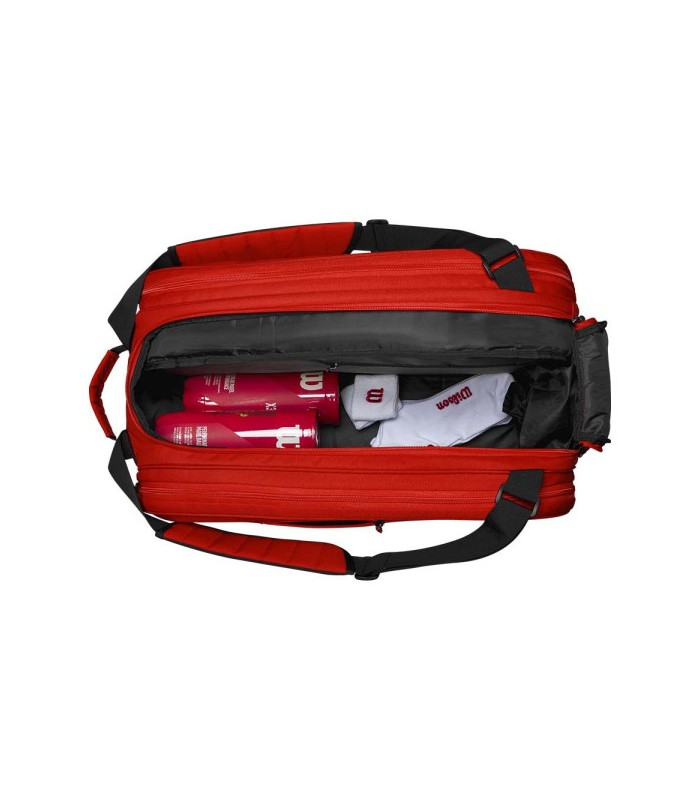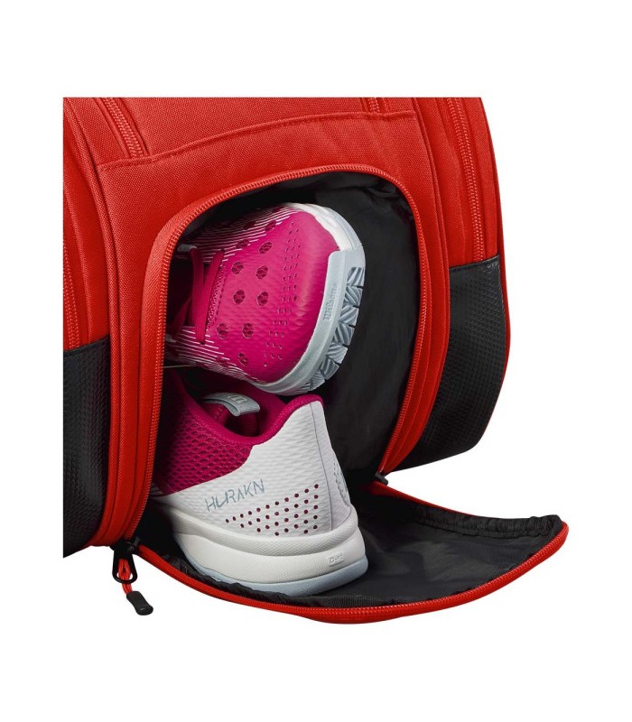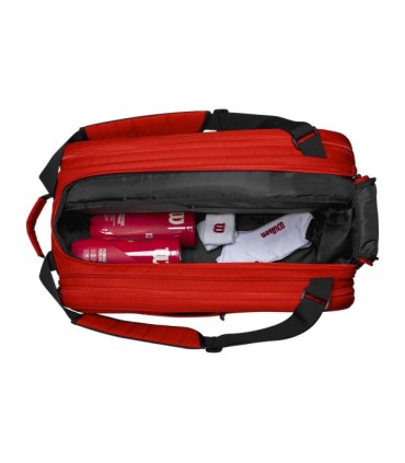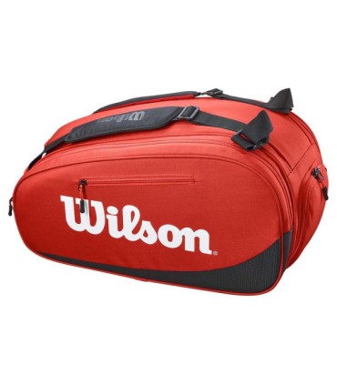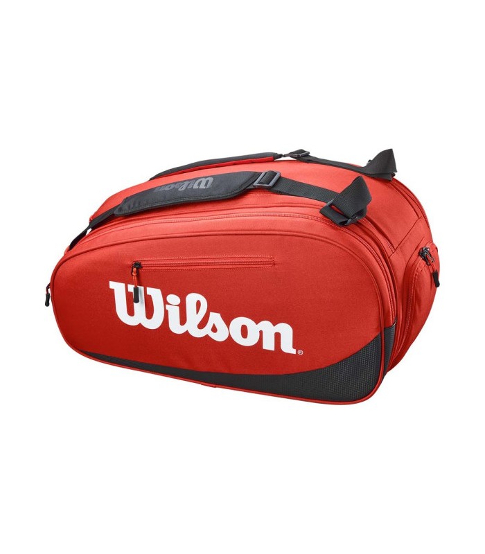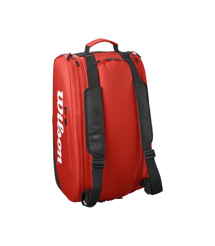 Quanto à sua estética, a bolsa apresenta as icônicas cores da Wilson, com um vibrante tom vermelho que não só adiciona um toque de dinamismo e energia ao seu traje esportivo, mas também reflete o espírito competitivo e apaixonado dos jogadores de padel. Este design não passará despercebido na quadra, garantindo que você se destaque não só pelo seu desempenho, mas também pelo seu estilo.