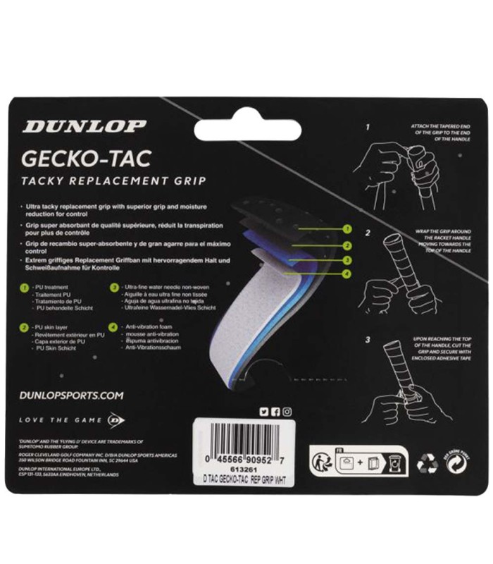 Fabricada pela Dunlop, uma marca reconhecida mundialmente por seu compromisso com a qualidade e inovação em artigos esportivos, a empunhadura Gecko-Tac é apresentada em um elegante cor branca. Seu design não apenas melhora o desempenho, mas também adiciona um toque estético sofisticado ao seu equipamento.